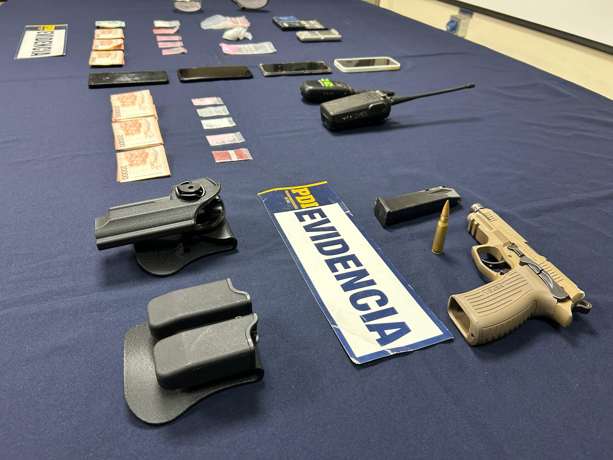 Ambos fueron detenidos por orden judicial, sumando además cargos por infracción a la Ley de Armas y la Ley 20.000, ya que uno de ellos mantenía en su poder un arma de fuego apta para el disparo, munición y drogas.