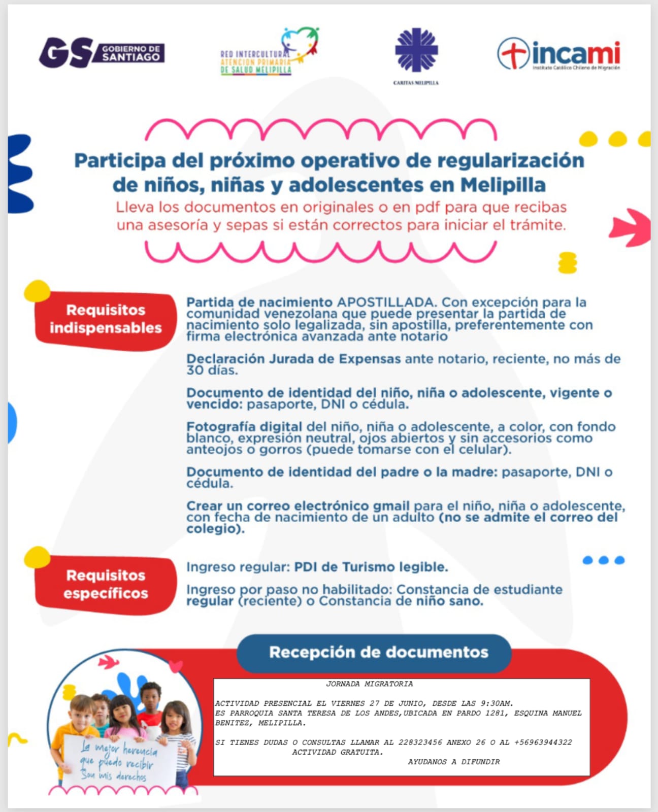 Una nueva jornada de atención y asesoría migratoria se desarrollará este viernes 27 de junio en el salón de la parroquia Santa Teresa de Los Andes, ubicada en calle Pardo esquina Benítez, en Melipilla.