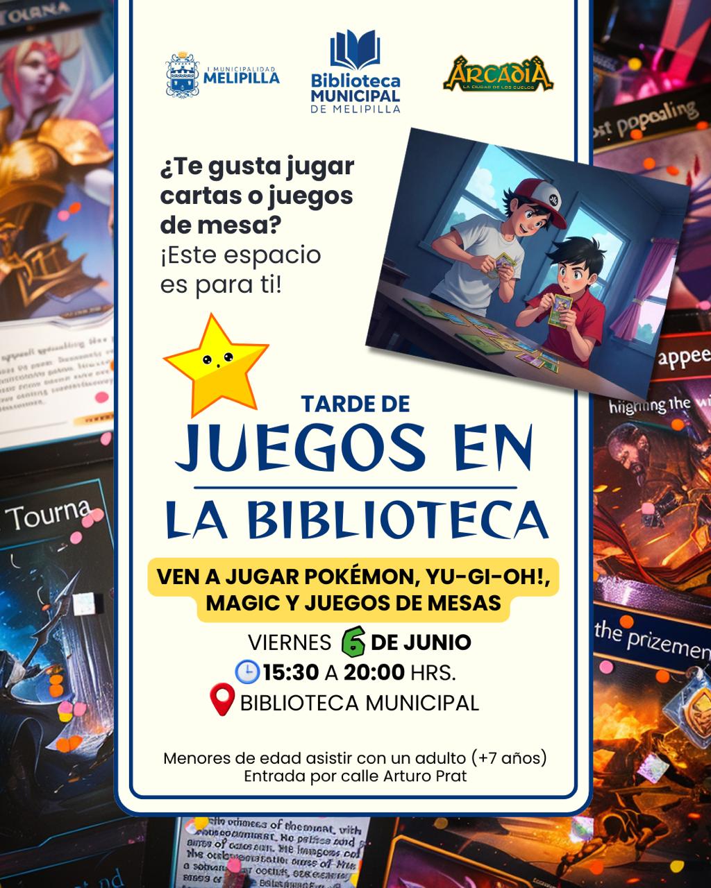 La Biblioteca Pública de Melipilla, en conjunto con Arcadia Melipilla, invita a la comunidad a participar en una entretenida tarde de juegos este viernes 06 de junio.